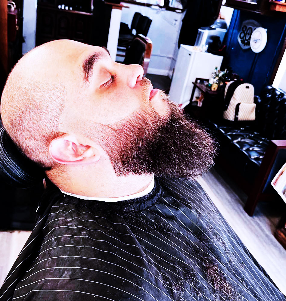 Straight razor head shave with detailed beard trim and hot towel finish.