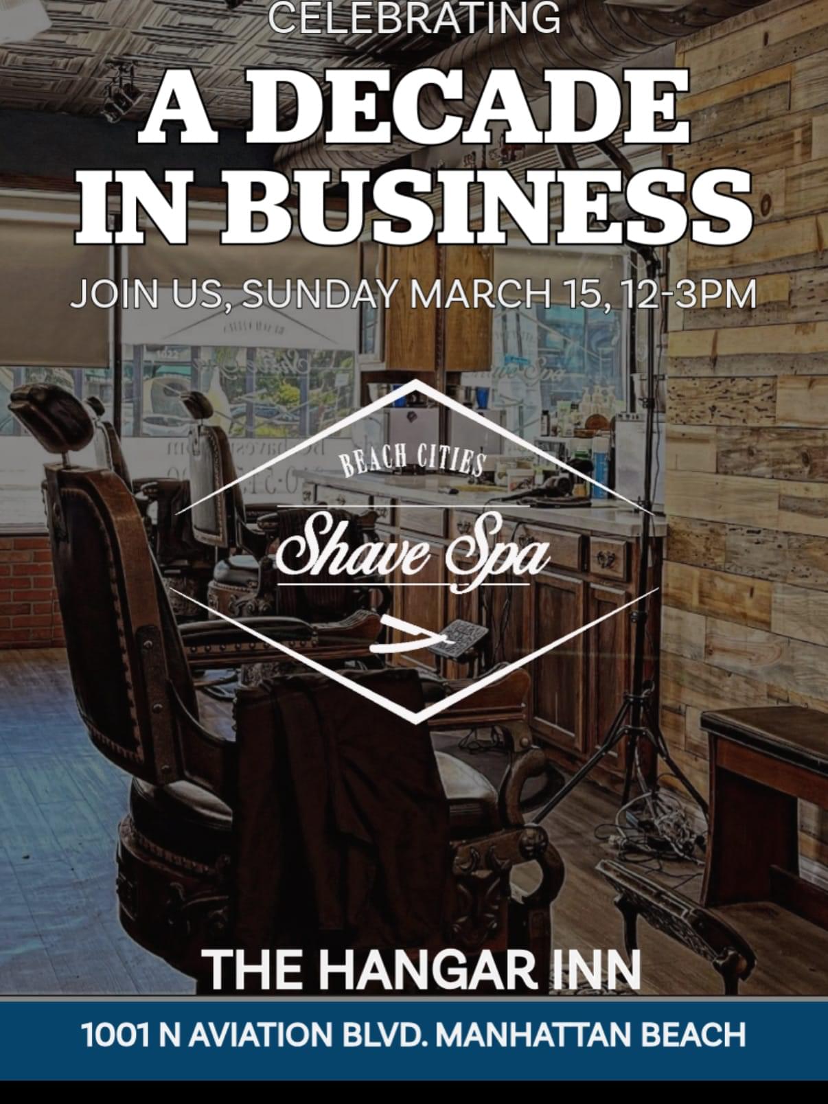 Ten years strong. Join Beach Cities Shave Spa for an anniversary gathering at The Hangar Inn. Expect a welcoming atmosphere, familiar faces, and a chance to celebrate the growth of a local brand built on loyalty and craftsmanship. We look forward to seeing you there.